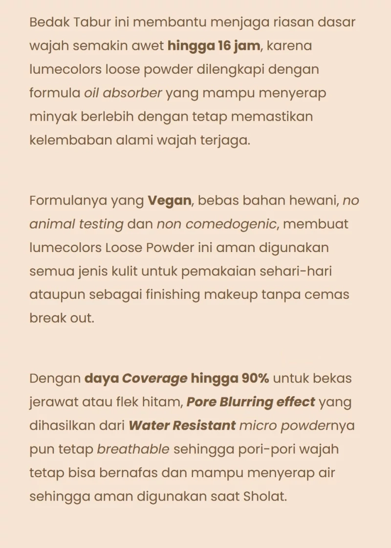 Iya, Produk LUMÉCOLORS Loose Powder aman & cocok digunakan untuk semua jenis kulit.